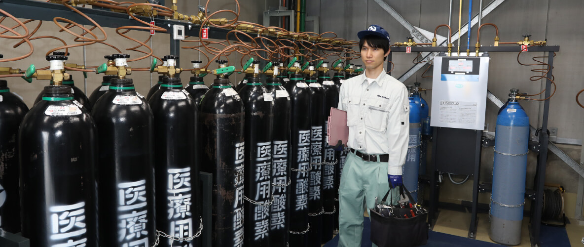 病院のベッドの枕元に、酸素などを供給するアタッチメントを見たことはありませんか?実は、その先(内部)には、酸素などを供給するシステムが病院中に張り巡らされています。私たちは、その設備を施工(設置)し、適正に動作するようメンテナンスするのが主な仕事です。まさに「命を守る」仕事といってもいいでしょう。先輩と2人1組のチームで、日々、様々な病院を訪問し、緊張感をもちながらも和やかな雰囲気の中で毎日作業しています。また、他にも手術室の施工なども担当することがあり、ドラマでしか見たことのない、ちょっとした「病院の裏側」を知ることもあります。